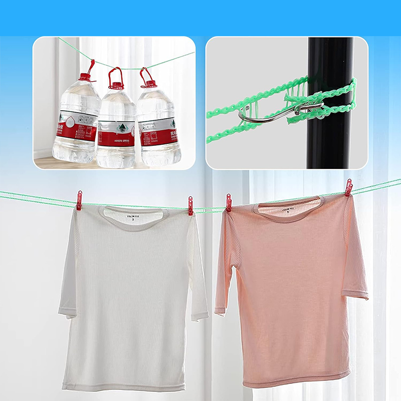 بند رخت بسیار بادوام در فضای باز، ساخته شده از نایلون، محکم و بادوام، طراحی نرده مانند منحصر به فرد باعث می شود لباس های شما سر نخورده و در یک جا جمع نشود، می توانید به راحتیانواه لباس ملحفه و اجاسام سنگین را آویزان کنید.این محصول دارای دو قلاب استیل ضد زنگ به راحتی قابل نصب است و می توانید طول آن را بر اساس نیاز خود تنظیم کنید.گیره از فولاد ضد زنگ ساخته شده است که نسبت به رخت آویز سنتی بادوام تر، عمر طولانی تر، انعطاف پذیری بالا و ویژگی منحصر به فرد این محصول بعد از استفاده میتوانید جمع کنید که بعد از جمع شدن فضای حدودی 4 سانتی متر را اشغال میکند.