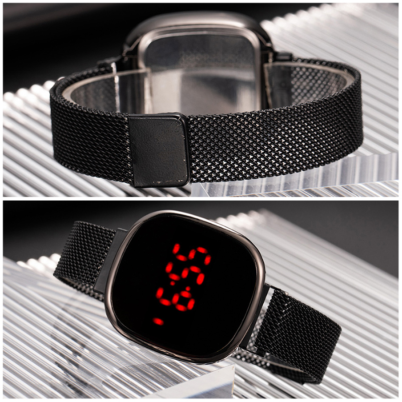 چراغ های LED قرمز رنگ ساعت را برای شما نمایش می دهد. صفحه نمایشی و مربع شکل ساعت در ابعاد 40 × 40 میلیمتر طراحی شده و ضخامت آن در قسمت بدنه 10 میلیمتر است. این ساعت