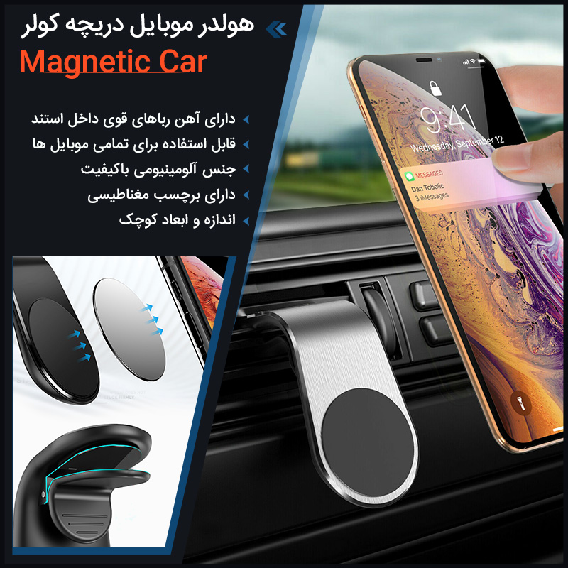 هولدر موبایل دریچه کولر Magnetic Car با قابلیت نصب بر روی دریچه کولر خودرو قادر است انواع گوشی‌های موبایل را در بازه اندازه 3.5 تا 7 اینچ نگاه دارد. جنس بدنه این هولدر از آلیاژ آلومینیوم است و در عین ظرافت و زیبایی، از مقاومت بالایی برخوردار است. پنج مگنت قدرتمند از عهده نگاه داشتن گوشی حتی بدون برداشتن قاب یا کاور آن به خوبی برمی‌آیند. کافیست صفحه فلزی چسبنده‌ای را که در پک محصول قرار دارد به گوشی بچسبانید یا در کاور آن قرار دهید تا هولدر از طریق جذب آن بتواند گوشی را نگاه دارد. نکته قابل توجه این است که میدان مغناطیسی این هولدر هیچ تداخلی با امواج گوشی پیدا نمی‌کند و اختلالی در ارتباط شبکه ایجاد نمی‌کند و این در حالی است که مغناطیس آن آنقدر قدرتمند هست که بتواند گوشی را حتی در جاده‌های ناهموار بصورت کاملا ایمن نگاه دارد. لبه‌های گیره هولدر با سیلیکون مخصوصی پوشیده شده است تا کمترین خراشی به دریچه کولر وارد نیاورد. این هولدر قادر است گوشی را در هر زاویه‌ای اعم از افقی و عمودی یا اریب نگاه دارد. قابلیت نصب و برداشتن آسان این هولدر از ویژگیهای خوبی است که استفاده از آن را برای اکثر کاربران مطلوب می‌سازد.